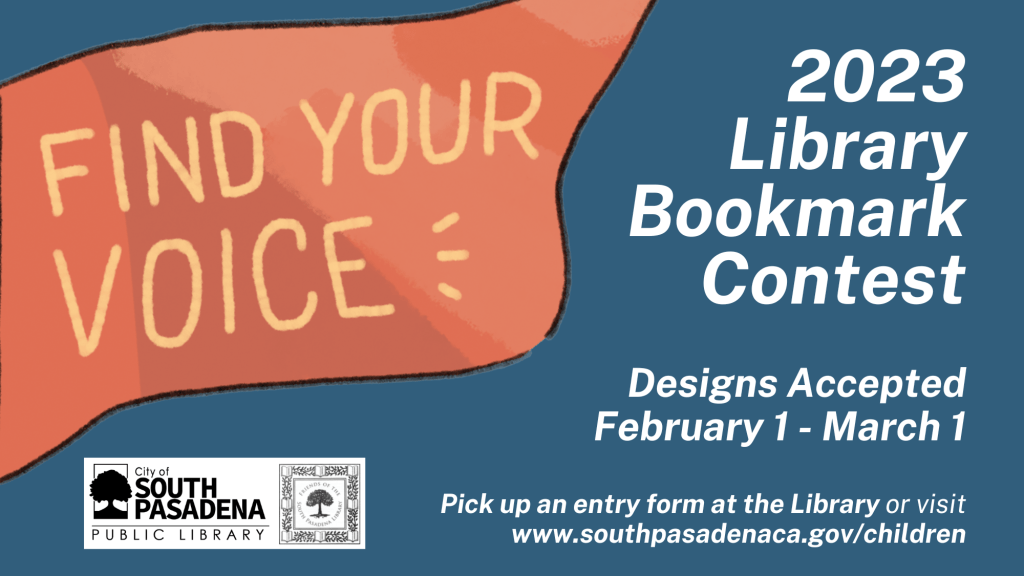 South Pasadena children and teens (grades K-12) are encouraged to use their imagination and create a one-of-a-kind bookmark with the upcoming 2023 Summer Reading Program theme “Find Your Voice” or that promotes books, reading and/or libraries. Contest forms are available on the website at www.southpasadenaca.gov/children or can be picked up in the Children’s Room.