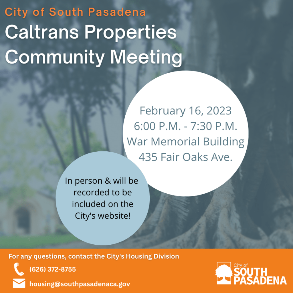Please join us! The Community Development Department is hosting a Community Meeting on the unoccupied Caltrans properties tomorrow from 6:00 p.m. to 7:30 p.m. in the War Memorial Building located at 435 Fair Oaks Avenue.