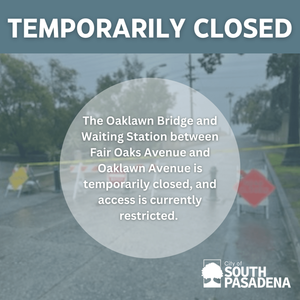 The Oaklawn Bridge and Waiting Station between Fair Oaks Avenue and Oaklawn Avenue is temporarily closed, and access is currently restricted. Please plan an alternate route for pedestrian and cyclist travel. We apologize for the inconvenience and will keep the community updated with more information as it becomes available.