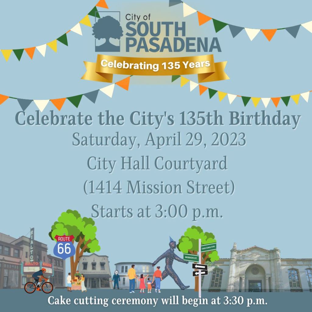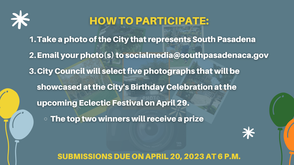- Join a Citywide Photo Contest! We are asking the community to submit photographs that represent South Pasadena to socialmedia@southpasadenaca.gov before April 20, 2023. Upon receiving these photos, we will share them with the City Council to choose their top 5 winners that will have their photos displayed at the City’s 135th Celebration on April 29 during the Eclectic Festival! The top two winners will also receive a special prize!