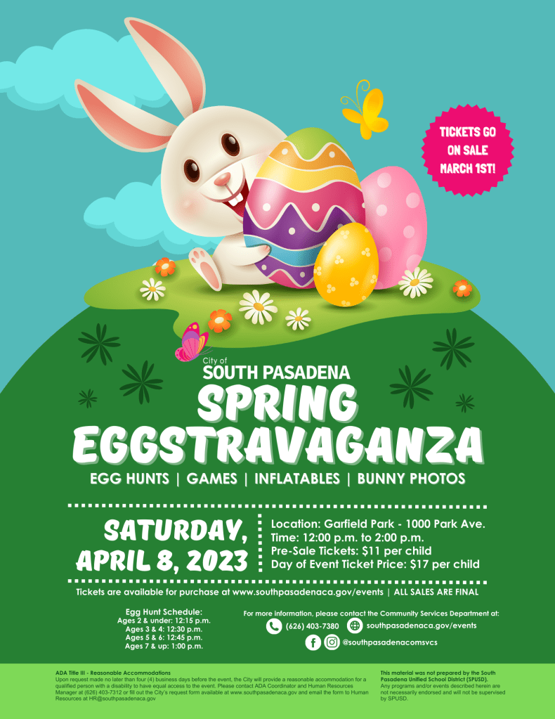 Day of tickets cost $17 per child! Buy your tickets today by visiting www.southpasadenaca.gov/events. All sales are final! We look forward to seeing you there for egg hunts, games, inflatables, and photos with the bunny!