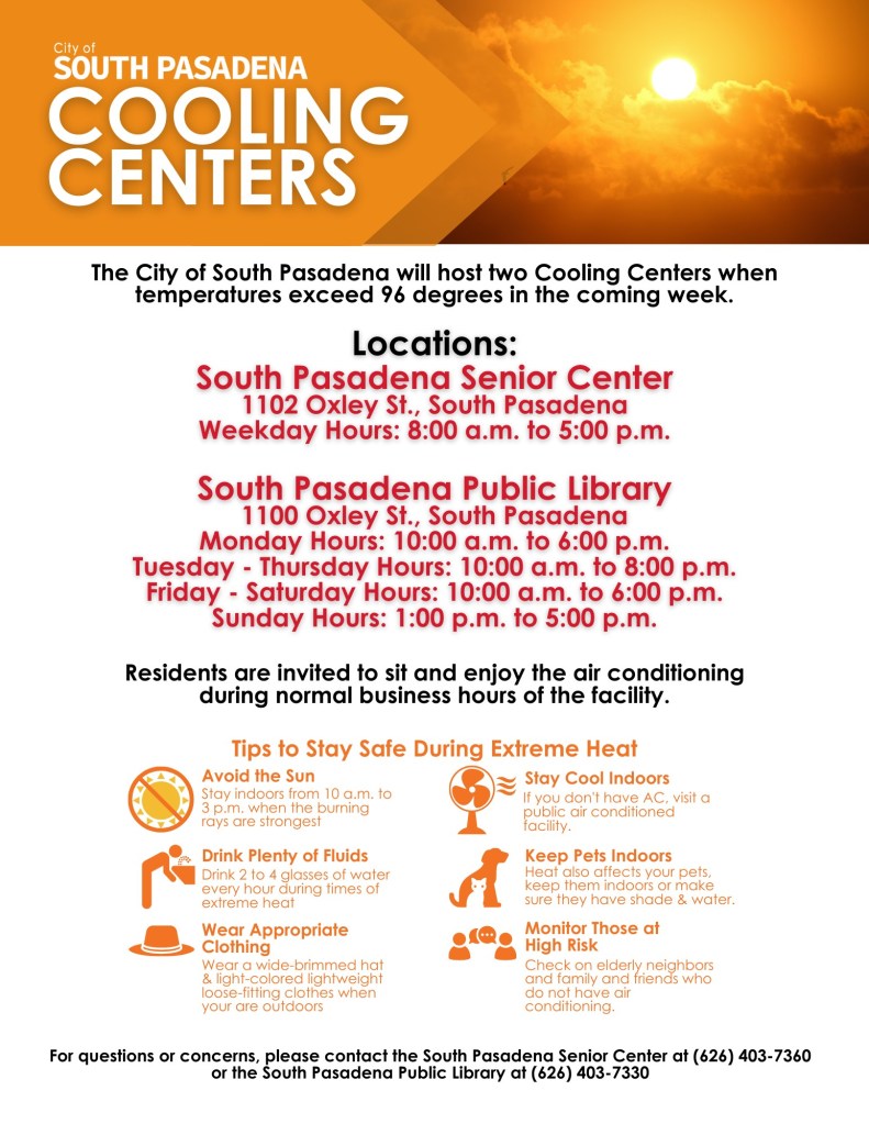 In response to forecasted excessive heat, the City of South Pasadena will host two Cooling Centers at the South Pasadena Senior Center, located at 1102 Oxley Street and the South Pasadena Public Library, located at 1100 Oxley Street.