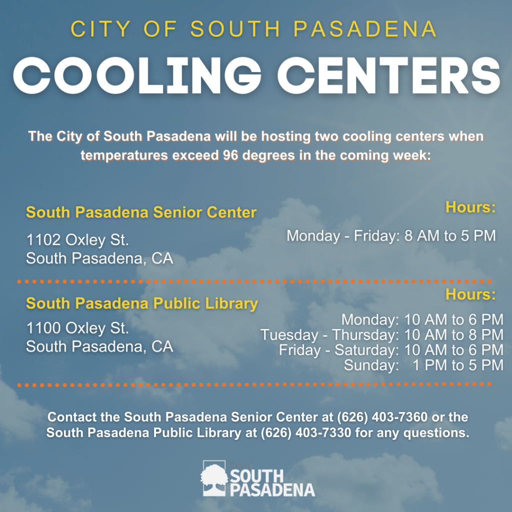 In response to forecasted excessive heat, the City of South Pasadena will host two Cooling Centers at the South Pasadena Senior Center, located at 1102 Oxley Street and the South Pasadena Public Library, located at 1100 Oxley Street.