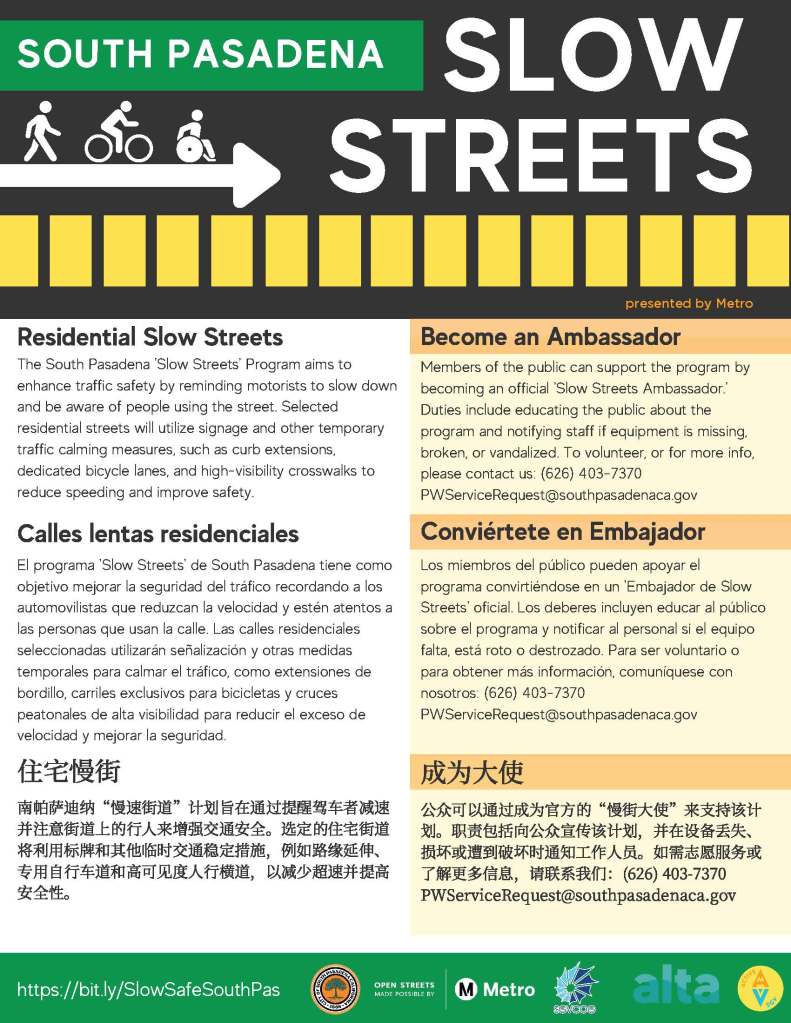 We are looking for ‘Slow Streets Ambassadors’ to join the City in educating the public about the program and to notify staff if equipment is missing, broken, or vandalized. To volunteer, contact us at PWServiceRequest@southpasadenaca.gov or call (626) 403-7370.