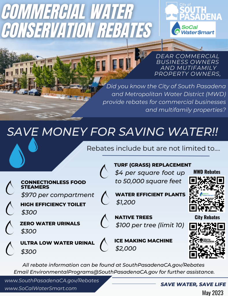 Are you interested in creating a sustainable landscape or finding ways to save water on your property? The City of South Pasadena provides water conservation rebates for our residents and businesses! Making small changes will have big impacts on water usage! Community members can purchase water-efficient plants and native trees or convert to drip irrigation on their South Pasadena property. More information can be found at SouthPasadenaCA.gov/Rebates or email EnvironmentalPrograms@SouthPasadenaCA.gov.