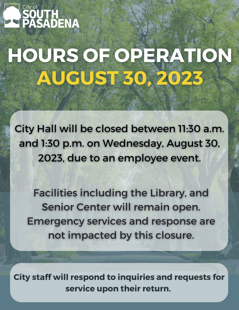 City Hall will be closed between 11:30 a.m. and 1:30 p.m. on Wednesday, August 30, 2023, due to an employee event.