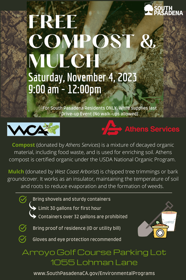 On Saturday, November 4, 2023, the City will be hosting a FREE Compost and Mulch Giveaway for South Pasadena residents. Stop by the Arroyo Golf Course Parking Lot (1055 Lohman Lane) between 9:00 am- 12:00 pm. Compost and Mulch will be given away on a first-come, first-served basis to South Pasadena residents ONLY, while supplies last. Please bring a sturdy container, a shovel, and proof of residence in South Pasadena.