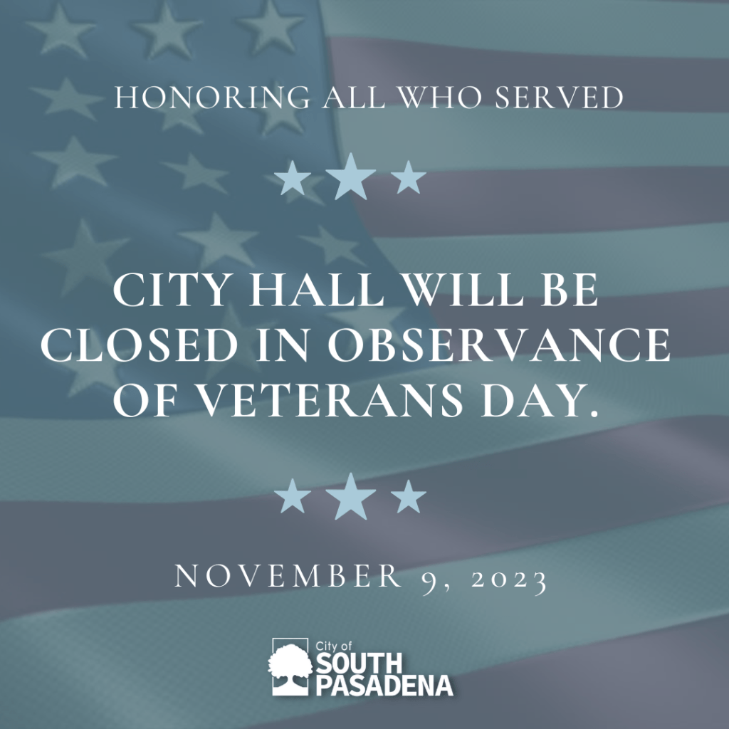 In honor of the Veteran’s Day holiday, City Hall will be closed on Thursday, November 9, 2023, and the South Pasadena Library will be closed Friday, November 10 through Saturday, November 11, 2023. We will resume service Monday, November 13, 2023.