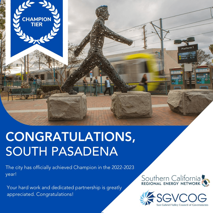 It is with great excitement that the City’s Sustainability Division announces the City of South Pasadena’s achievement in reaching the Champion Tier (the highest tier) in San Gabriel Valley COG’s Energy Champion Awards! The Energy Champion Awards recognize efforts in increasing energy efficiency in municipal facilities and engaging in long-term strategic planning for energy efficiency. Thank you for being a part of the City’s journey through the Energy Champion Awards and helping us take the steps necessary to accomplish our goals.