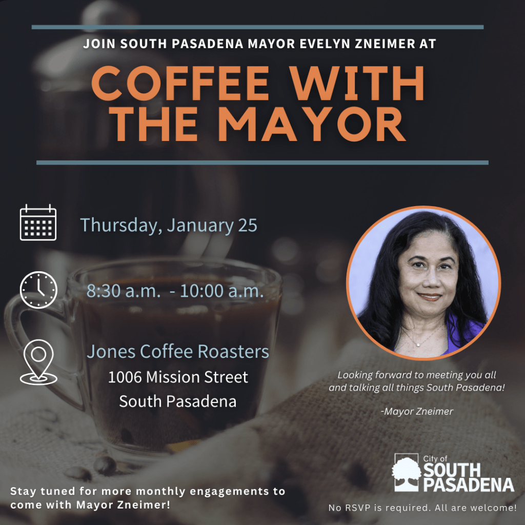 ☕ Come grab a cup of coffee at Jones Coffee tomorrow, Thursday, January 25 from 8:30 a.m. – 10:00 a.m., and meet Mayor Evelyn Zneimer! Mayor Zneimer is looking forward to a year of engaging with the community on a monthly basis. Looking forward to seeing you there ☕