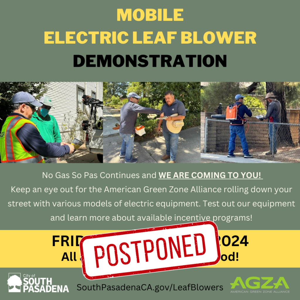 Due to the recent storm, we will be rescheduling our February 9 Mobile Leaf Blower Demonstration to a later date. The new date for the event will be announced soon! Visit SouthPasadenaCA.gov/LeafBlowers for more information on the ban and available incentives.