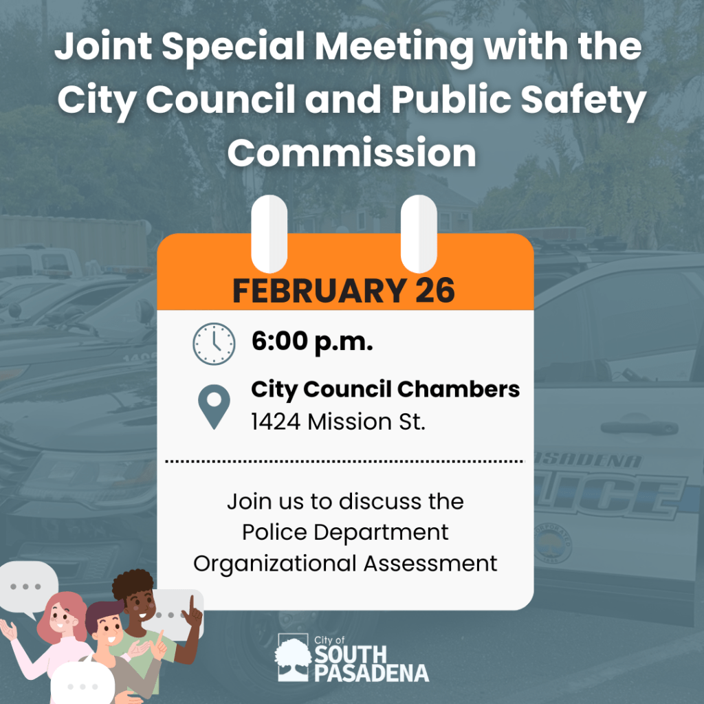The City Council and the Public Safety Commission are planning to hold a joint meeting to discuss the findings of the Police Department Organizational Assessment. They invite interested individuals to a community meeting on February 26th at 6:00 p.m. The meeting will occur at the City Council Chambers at 1424 Mission Street. We look forward to seeing you there!