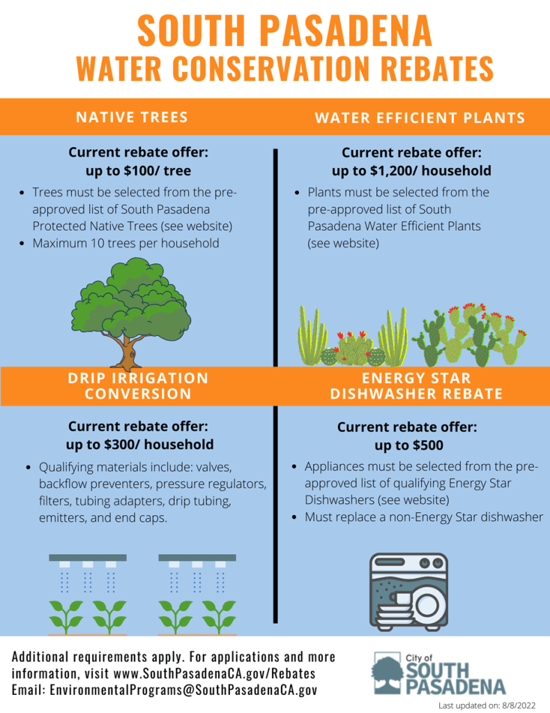 Are you interested in finding ways to save water on your property? The City of South Pasadena provides water conservation rebates for our residents and businesses! Making small changes will have big impacts on water usage! Community members can purchase water-efficient plants and native trees or convert to drip irrigation on their South Pasadena property for a rebate. For more information, visit SouthPasadenaCA.gov/Rebates or email EnvironmentalPrograms@SouthPasadenaCA.gov.