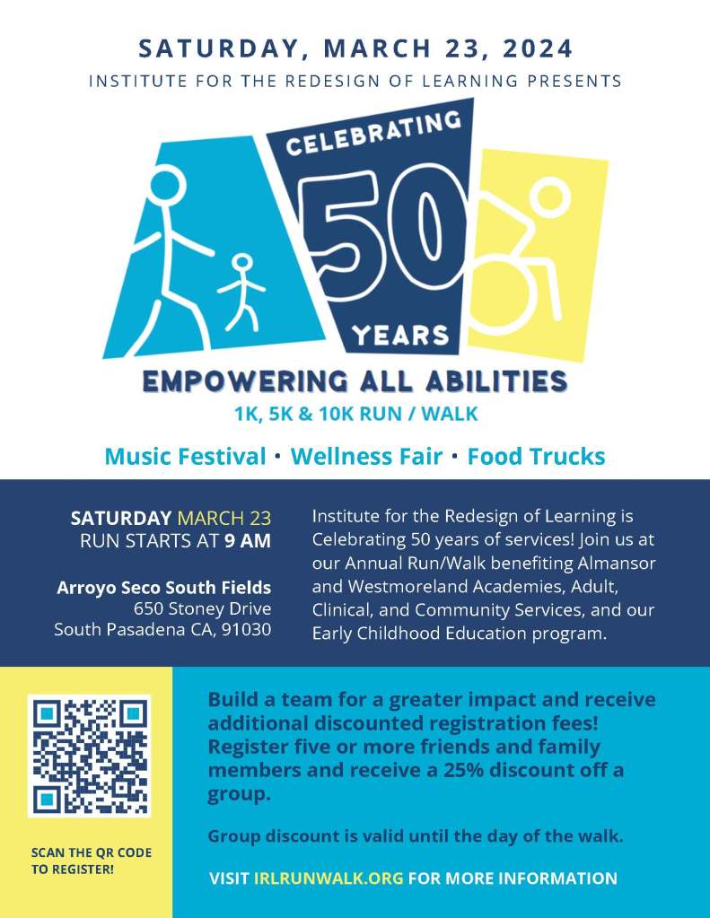 Join us on Saturday, March 23, as we run, and walk on the Arroyo Seco Trail to support the Institute for the Redesign of Learning in its mission to empower individuals of all abilities! Participants can choose to build a team or run on their own.