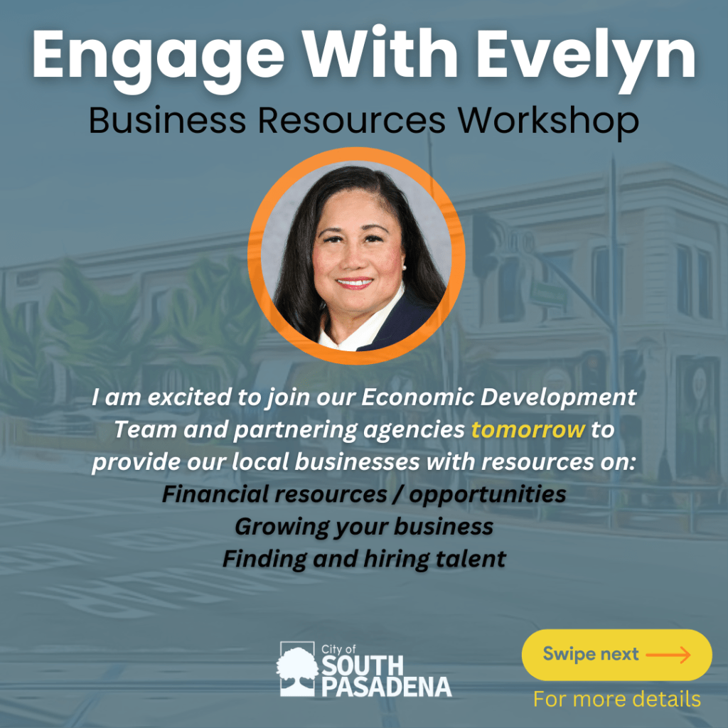 Did you know that Mayor Evelyn Zneimer is engaging with the community every month? Join us tomorrow at our Business Resources Workshop, where Mayor Zneimer will introduce the team and presenting partners. We invite all South Pasadena businesses to RSVP by emailing business@southpasadenaca.gov.