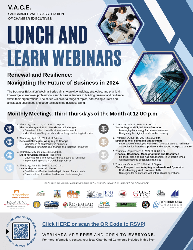 Join us for a series of Lunch and Learn Webinars brought to you by a partnership of Chambers of Commerce in the region, including South Pasadena’s Chamber of Commerce. Get insights on the current business environment, key trends and challenges, adaptability strategies, and more. Attend monthly meetings every third Thursday at 12 p.m. and gain practical knowledge to navigate the future of business in 2024. Click here to register for each upcoming webinar!