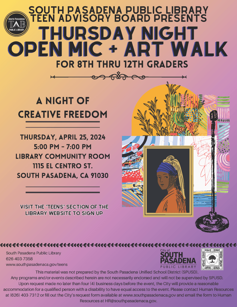 Attention Teens in 8th through 12th grade. Join us at the South Pasadena Public Library for Thursday Night Open Mic + Art Walk, an event for you to freely express yourself at the microphone, through your art, or both! We hope to see you there!