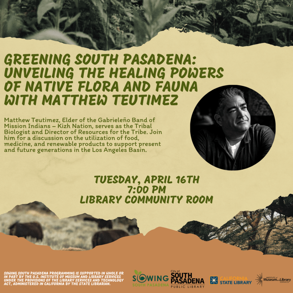 Matthew Teutimez, Elder of the Gabrieleño Band of Mission Indians – Kizh Nation, Biologist, and Director of Resources for the Tribe, will lead an enlightening discussion entitled “Greening South Pasadena: Unveiling the Healing Powers of Native Flora and Fauna for Earth and Body.” Drawing from his expertise in ethnobotanical studies and cultural practices, Matthew will explore the rich heritage and sustainable practices of the Kizh-Gabrieleño Tribe, focusing on the significance of native flora and fauna in promoting environmental and human health within the Los Angeles Basin.