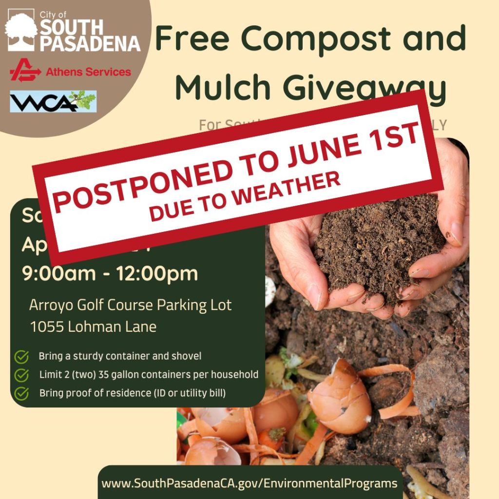 The compost and mulch giveaway event, which was planned for this Saturday, has been postponed due to the expected rainy weather. Our priority is the safety and enjoyment of all attendees, so we have rescheduled the event for Saturday, June 1st. The event will still take place from 9am to 12pm at the Arroyo Golf Course Parking Lot. We apologize for any inconvenience caused by this change and appreciate your understanding. We look forward to seeing you on June 1st!