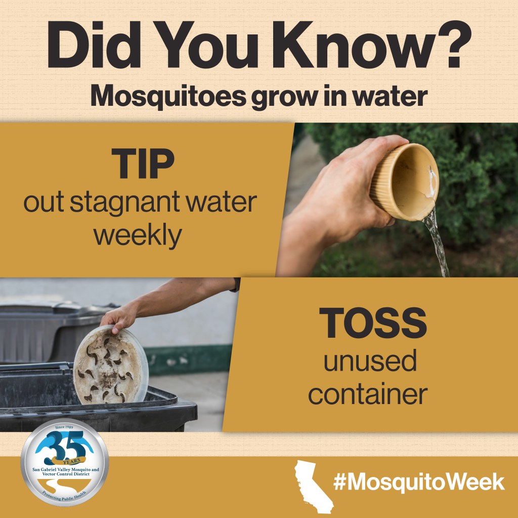 Stop mosquitoes at the source! Stagnant water is where mosquitoes grow.