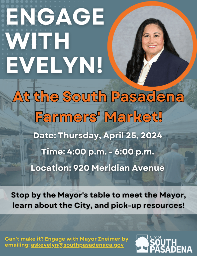 Join us for another exciting opportunity to meet with the Mayor of South Pasadena, Evelyn Zneimer, at the Farmers’ Market. She will be available from 4-6 PM on Thursday, April 25 to meet with the community and distribute City resources. This is a great chance to stop by the Mayor’s table, get to know her, and learn more about the City. We hope to see you there!