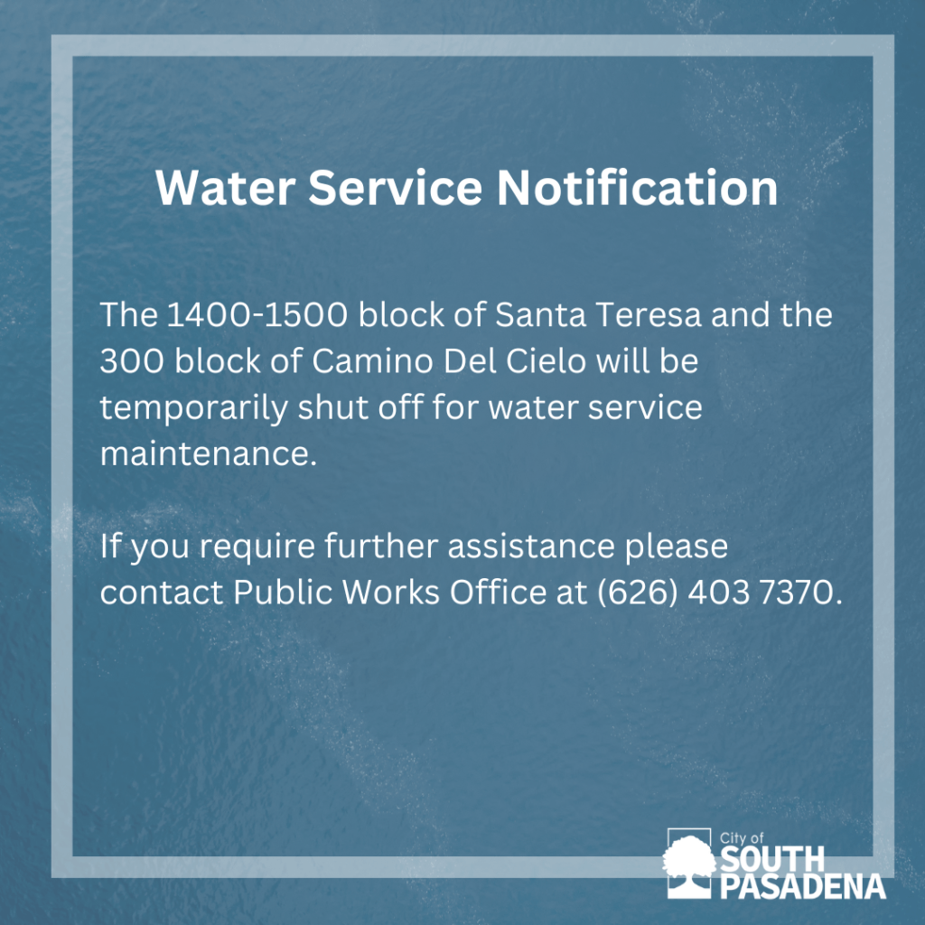 The 1400-1500 block of Santa Teresa and the 300 block of Camino Del Cielo will be temporarily shut off for water service maintenance.