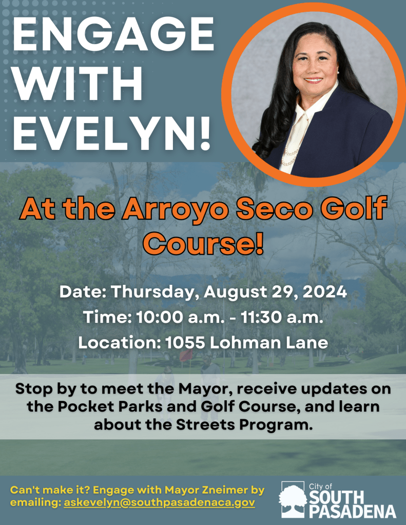 City of South Pasadena Mayor Evelyn G. Zneimer invites you to attend the next engagement opportunity for community members to connect with her and learn more about the City’s initiatives and happenings.