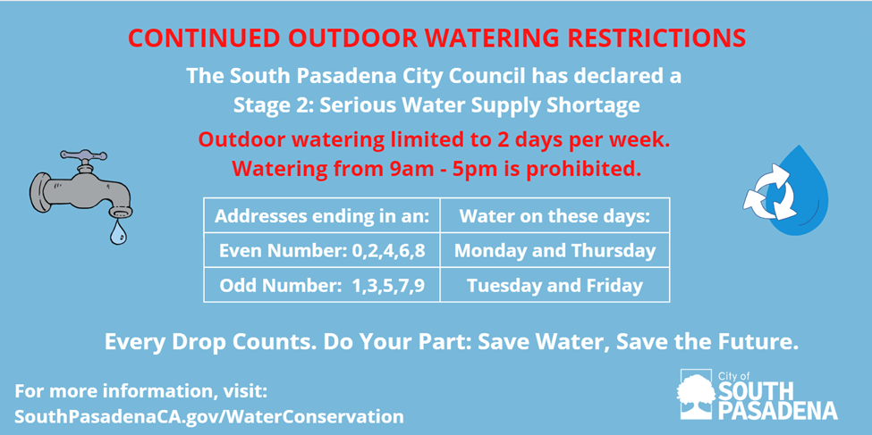 Please refer to SouthPasadenaCA.gov/WaterConservation for additional information on these watering restrictions. Fines will be issued for non-compliance!
