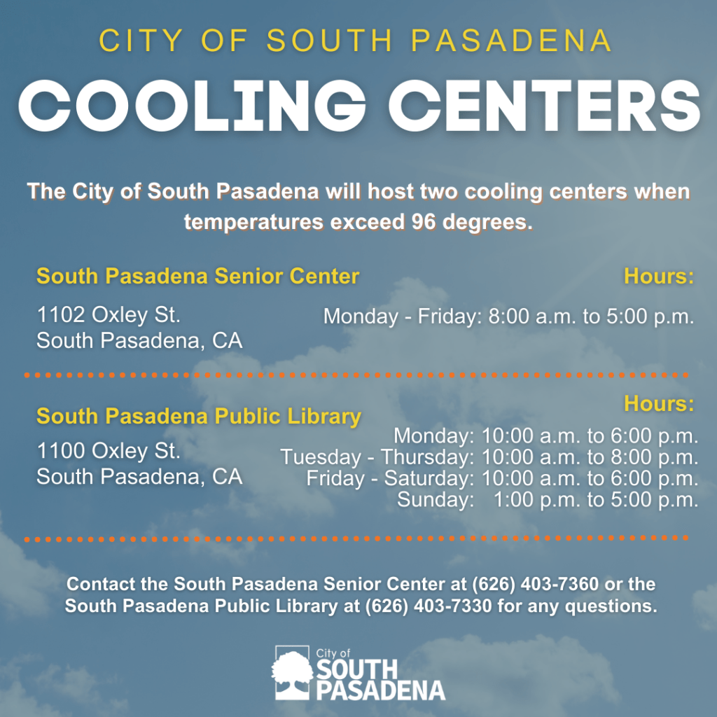 In response to forecasted excessive heat, the City of South Pasadena will activate two Cooling Centers when temperatures reach 96°F or higher at the South Pasadena Senior Center, located at 1102 Oxley Street and the South Pasadena Public Library, located at 1100 Oxley Street.