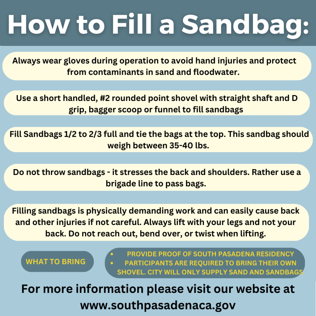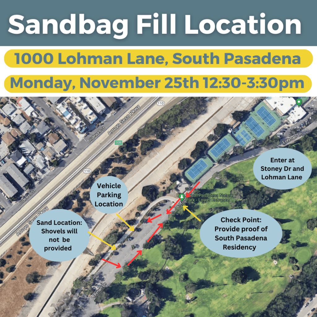 In preparation for upcoming storms, Public Works will have sandbag pick-available at 1000 Lohman Lane, South Pasadena, 91030.