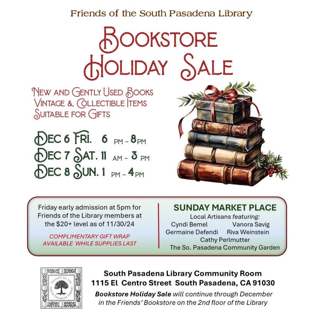 The Friends of the South Pasadena Public Library’s annual Book (and More!) Holiday Sale will be held in the Library Community Room (1115 El Centro) on December 6th, 7th, and 8th.