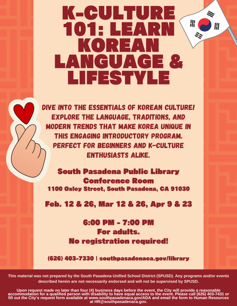 Dive into the world of K-Culture! Join us at the South Pasadena Public Library for K-Culture 101: Learn Korean Language & Lifestyle!