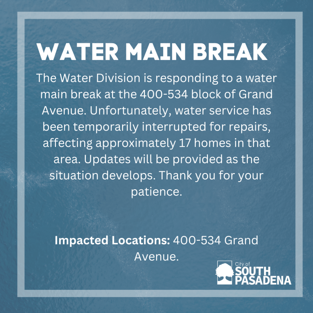 The Water Division is responding to a water main break at the 400-534 block of Grand Avenue. Unfortunately, water service has been temporarily interrupted for repairs, affecting approximately 17 homes in that area. Updates will be provided as the situation develops. Thank you for your patience.