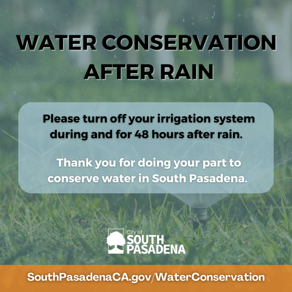 Remember – spray irrigation during and after rain is prohibited. Please make sure to check your irrigation system to ensure it is turned off for at least 48 hours after rain. Thank you for doing your part to conserve water in South Pasadena. For more tips, visit: www.SouthPasadenaCA.gov/WaterConservation.