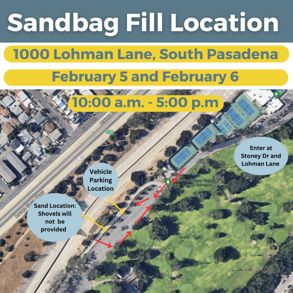In preparation for upcoming storms, Public Works is offering a sandbag fill-up station at 1000 Lohman Lane, South Pasadena, 91030.