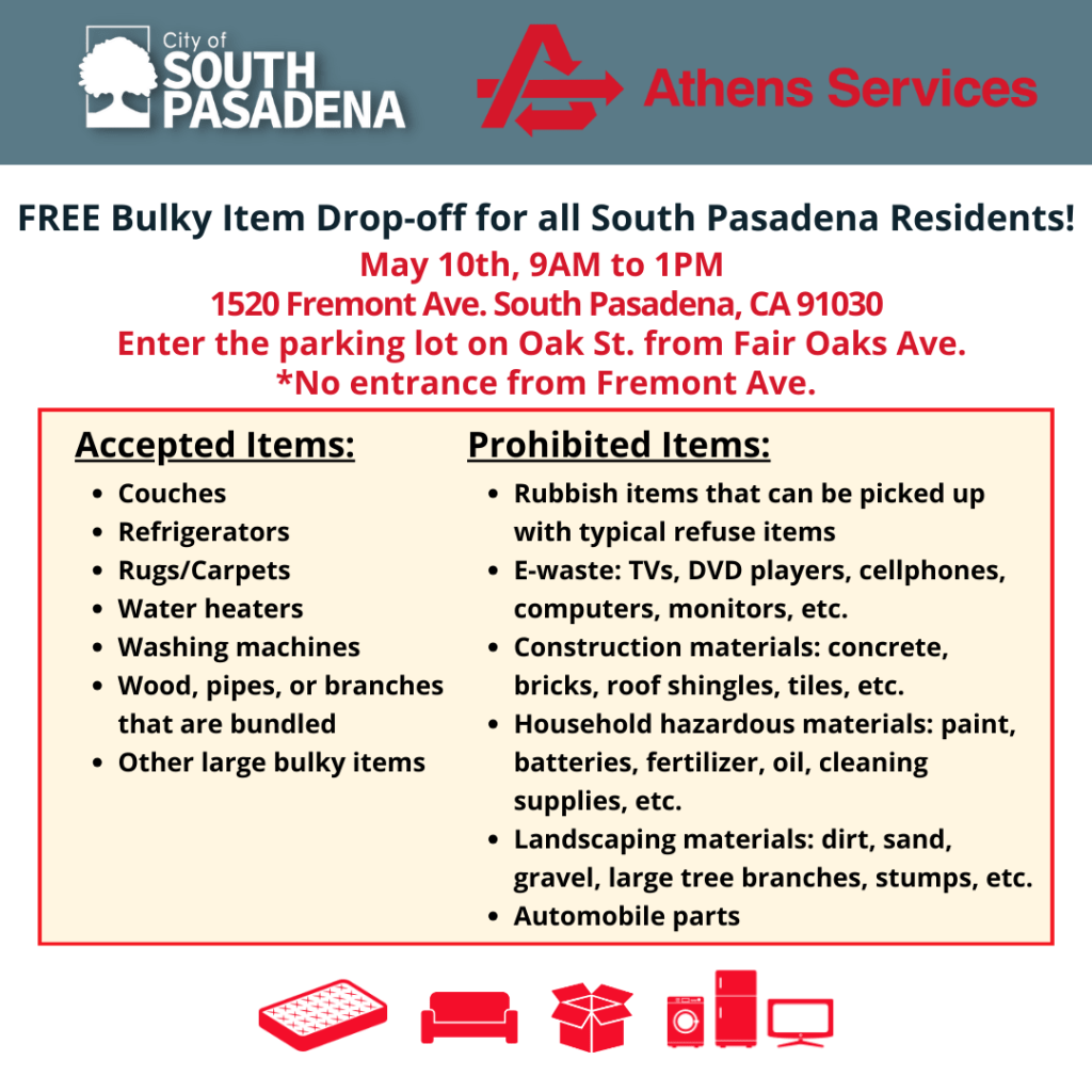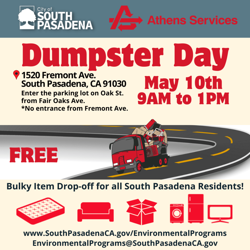 Need to get rid of that old couch? Bring it to Dumpster Day! On Saturday, May 10, 2025, from 9:00 a.m. to 1:00 p.m., South Pasadena residents can drop off their large furniture, appliances, and other bulky items for free. Bring them by the drive-thru event at 1520 Fremont Avenue. Enter the parking lot on Oak Street from Fair Oaks Avenue. There will be no entrance to the parking lot from Fremont Avenue.