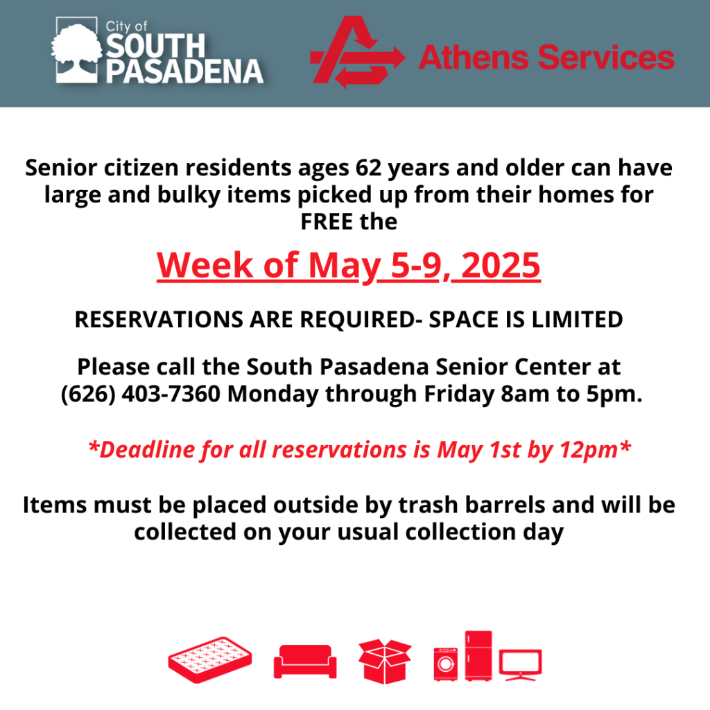 Senior citizens can also reserve a free bulky item pick up for the week of May 5th to May 9th. Reservations are required and space is limited. Please call the South Pasadena Senior Center at (626) 403-7360 to reserve by the May 1st noon deadline.