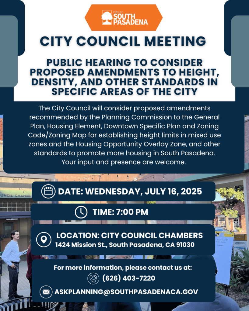 🏙️ Have your voice heard! The City Council is holding a public hearing to discuss proposed changes to height limits, density, and development standards in South Pasadena. Your input matters—help shape the future of housing in our community.