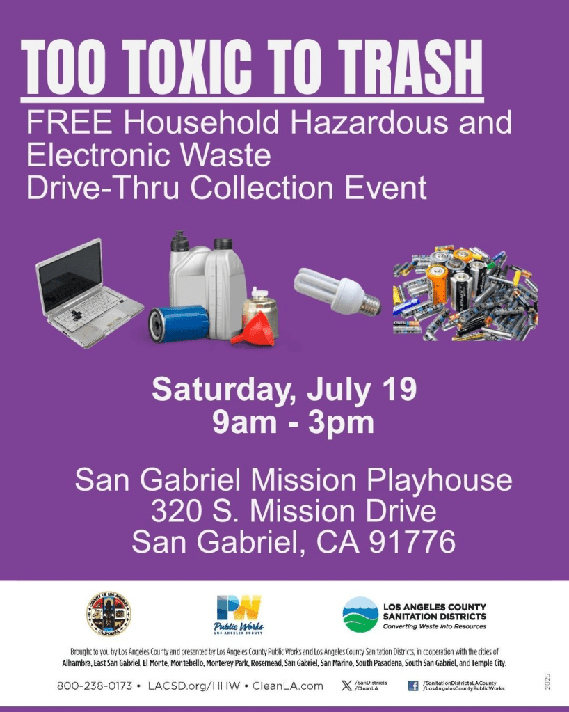 Have you been hanging on to those old paint cans and dead batteries forever because you know you can’t just throw them away in the trash?? Thank you, good citizen! Now, gather up all your hazardous and electronic waste and head down to the LA County Too Toxic to Trash event happening close by in San Gabriel on July 19. The Drive Thru format allows you to stay in your vehicle while trained staff remove the waste from your trunk for you. Here are a few rules to keep in mind: