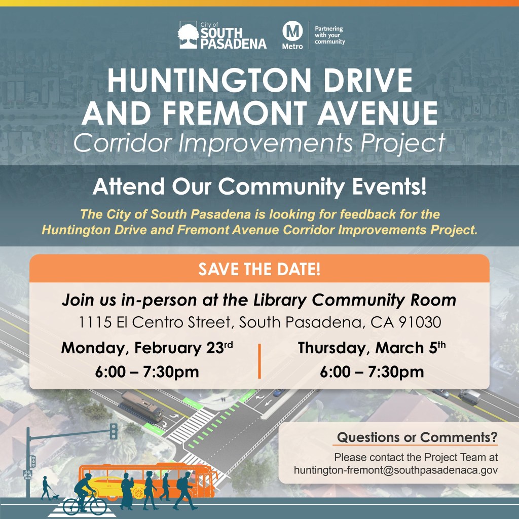 The City of South Pasadena invites residents to attend the second community meeting on the Huntington Drive & Fremont Avenue Corridor Improvements Project.