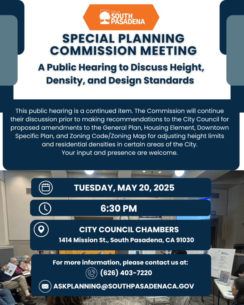 A Special Planning Commission meeting will be held on Tuesday, May 20, to continue their discussion for proposed amendments to the General Plan, Housing Element, Downtown Specific Plan, and Zoning Code/ Zoning Map for adjusting height limits and residential densities in certain areas of the City. Your input and presence are welcome! Join us at 6:30 p.m. in the City Council Chambers, 1424 Mission Street.