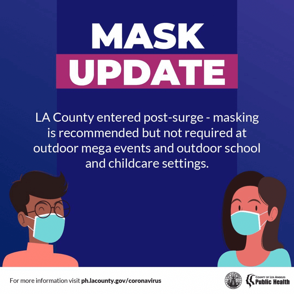 With hospitalizations under 2,500 for seven consecutive days, Public Health issued a modified LA County Health Officer Order on February 16, 2022, recommending, but no longer requiring, masking at outdoor mega events and outdoor spaces at K-12 schools and childcare centers. While masking will no longer be required at outdoor Mega Events or in outdoor spaces at childcare facilities and K-12 schools, the masking requirement at indoor establishments will continue until: